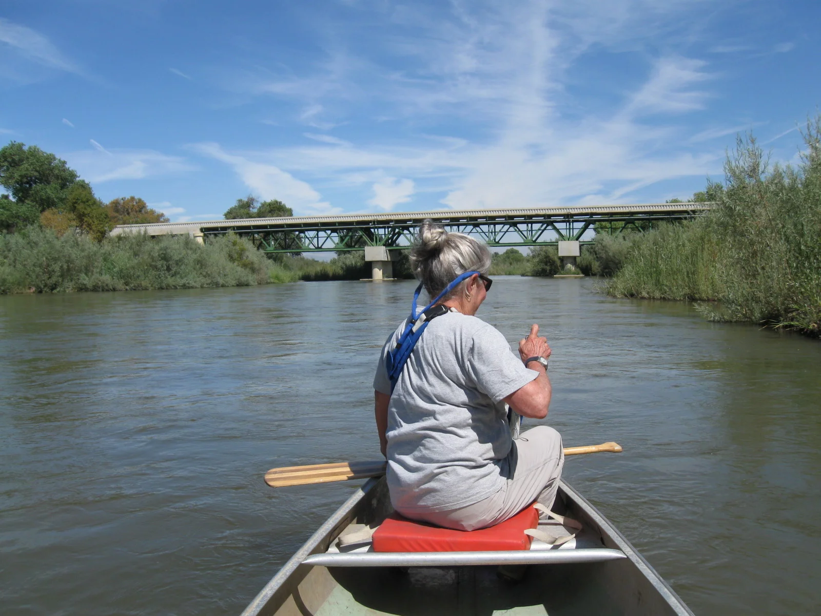 There was no need to paddle - the canoe was moving rapidly downstream - all we needed to do was to ‘steer’ it and that was tricky enough! The river was wide and didn’t seem that deep but it was really moving. There were even slight ‘rapids’ that made it exciting. We hadn’t gone far when we spotted the roll of Marine Rope wedged into some wood on a sandbar - we tried to turn and go back upstream to get it but absolutely couldn’t manage it - so that bore witness to the difference between paddling upstream at San Ardo the previous summer and doing it right here at this spot! I spotted the horses I had seen from the road on N*** B******’s ranch so I knew we were floating through that property. There was a different feeling along this stretch of the river - a feeling of openness - the growth was not as dense as downstream and you could see through it to fields and hills that were beyond the river. Along the shore were tall trees, oaks and bay laurels as well as some sycamores. There were also many more “beaches”, long ones that existed along the shore - on what I presume was N***’s ranch there was one that was at the end of a dirt road and picnic tables were set up with a Bar-B-Que. The water was pretty clear and you could see the bottom - all of a sudden I noticed our paddle caught against some plants - this time we were able to catch it. A bit later I saw a strange green thing bobbing along and Randy figured out that it was his bottle. It was a race to catch it before it floated into a pile of brush and wood and also to avoid getting swept into the pile ourselves! So far we had not really seen that much wild life except for ducks. The mallards flew away from us before we got close - but there were these pretty brown ducks who seemed completely unfazed by our presence.